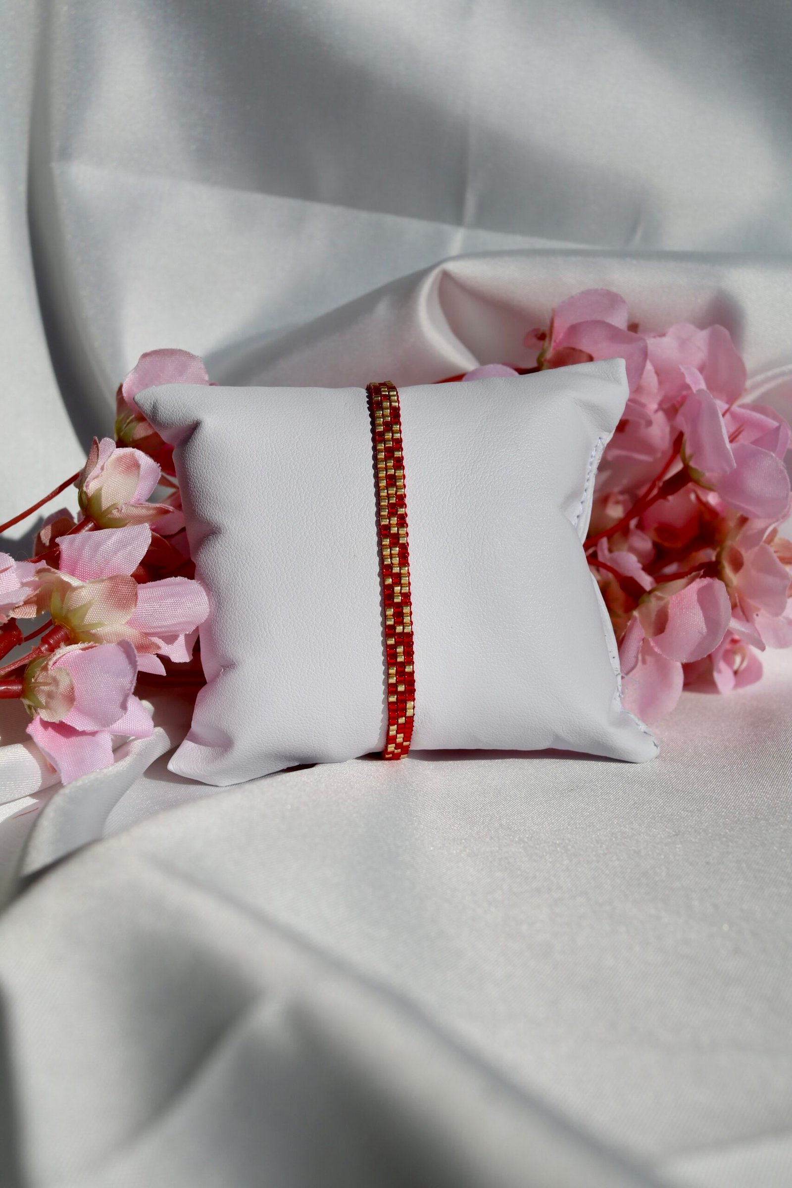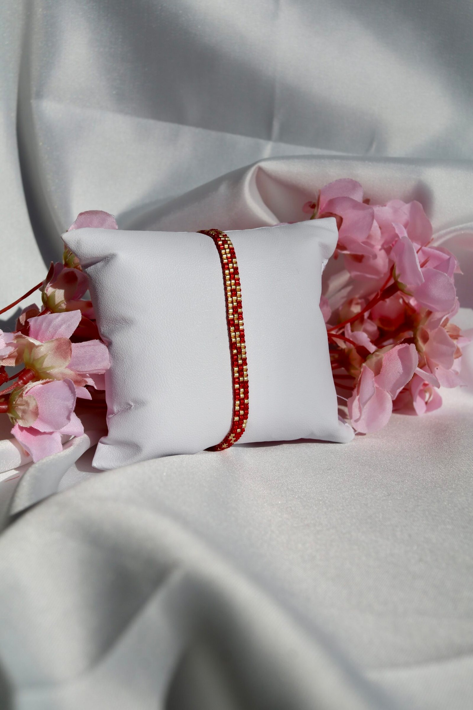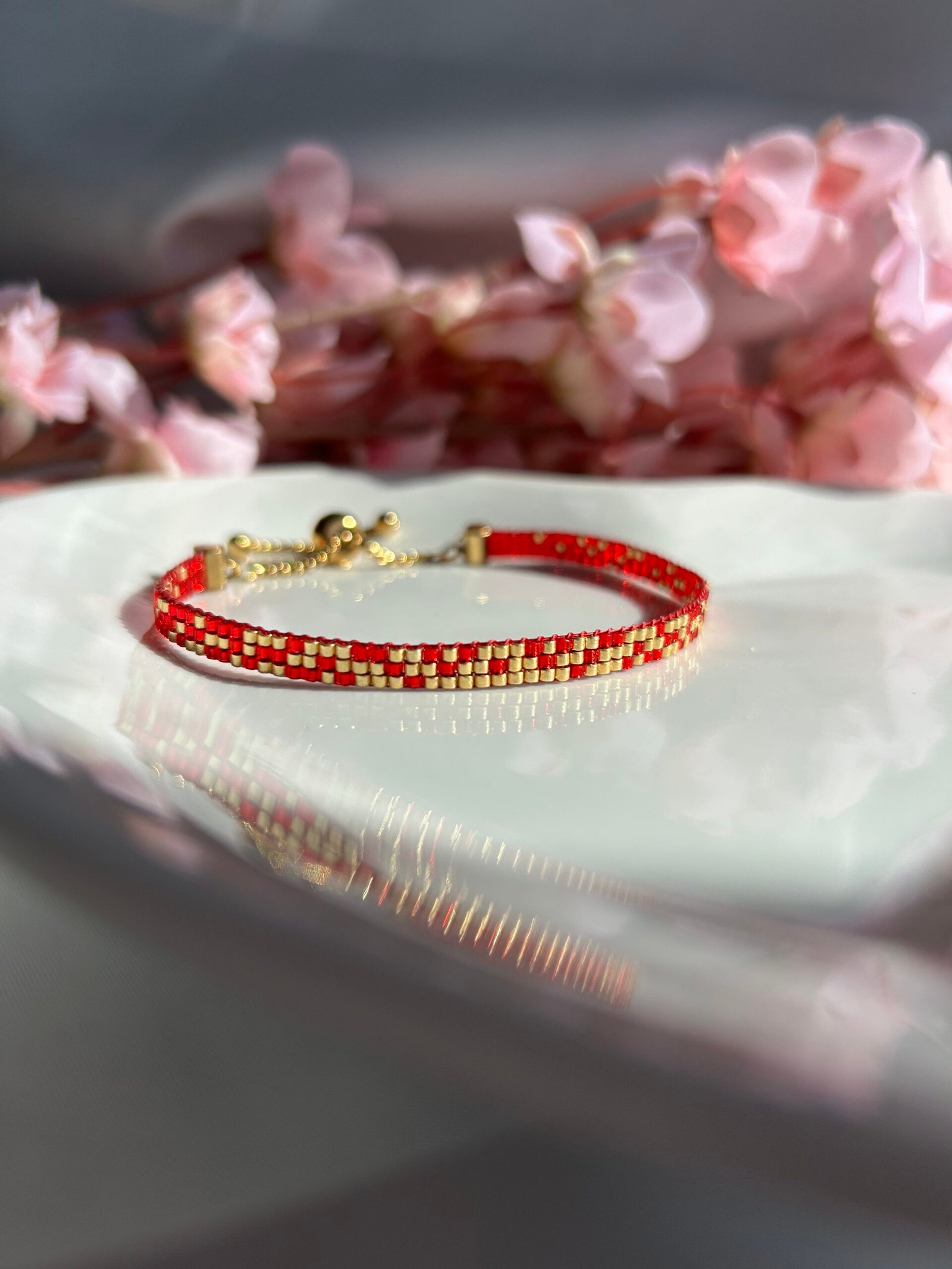 Tissé à la main en perles Miyuki rouge intense et or lumineux, il exprime une énergie chaleureuse, à la fois puissante et élégante.