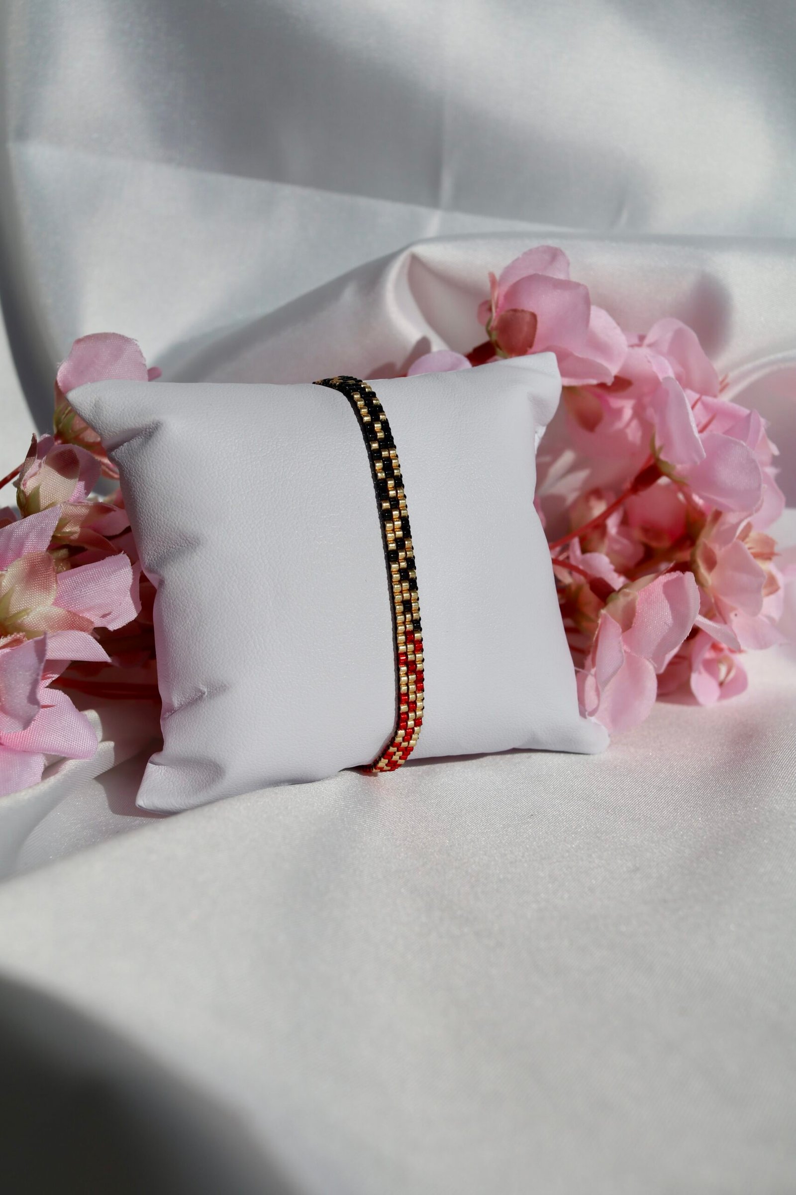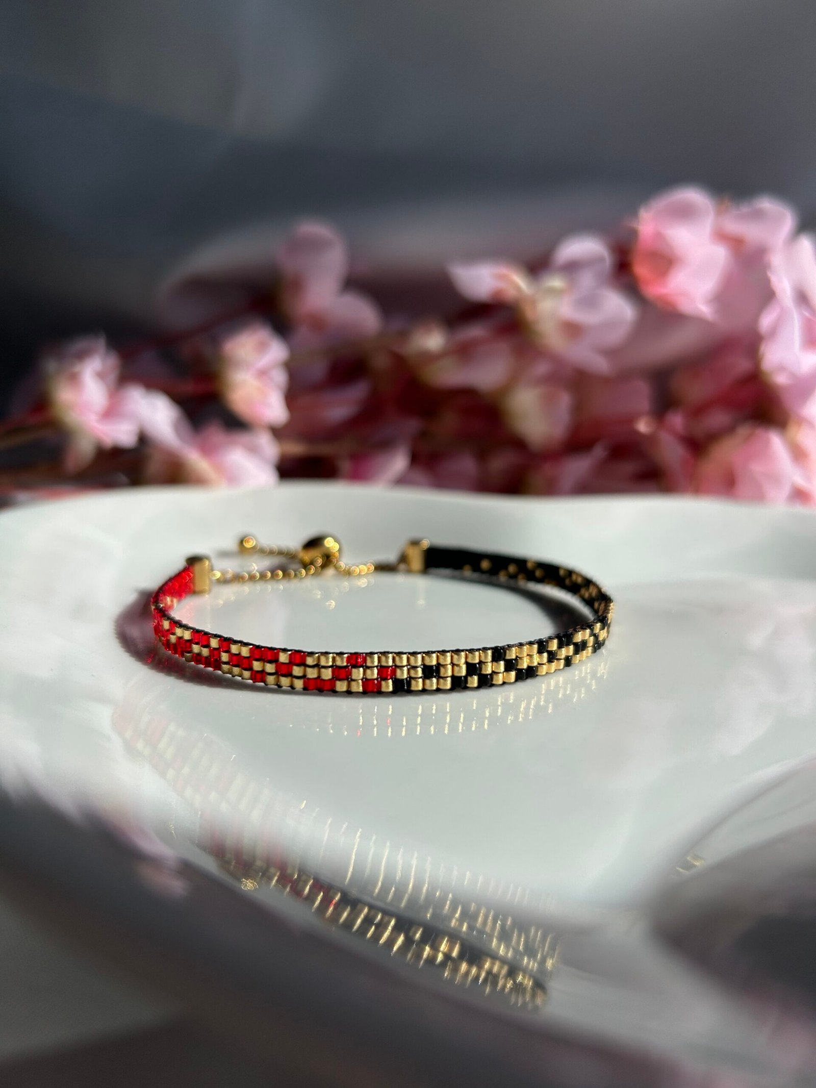 Tissé à la main en perles Miyuki noir profond, or lumineux et rouge intense, il incarne l’équilibre entre mystère, éclat et passion.
