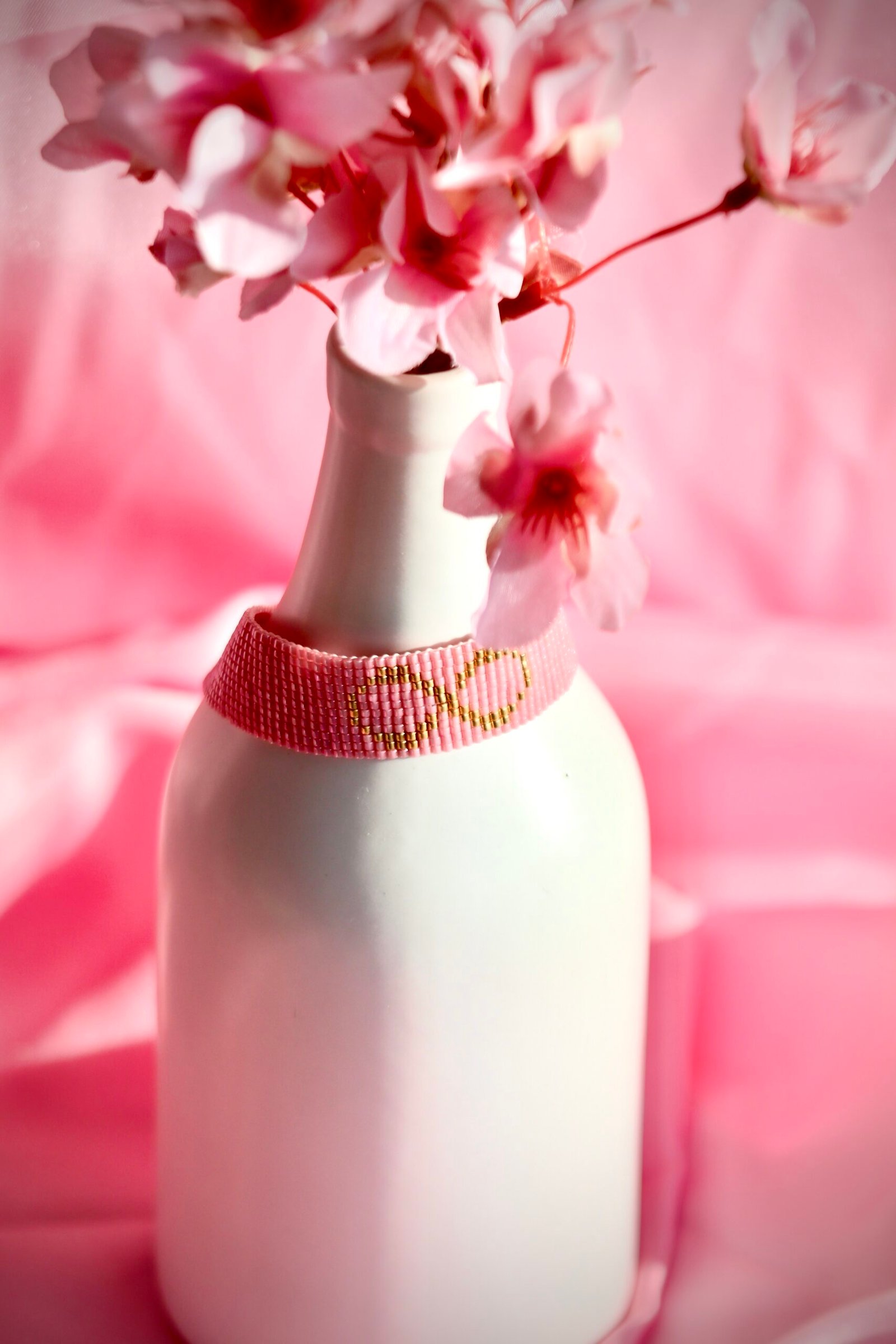 Son motif infini doré, délicatement tissé à la main sur un fond rose poudré, évoque la douceur, la bienveillance et la promesse d’un attachement qui traverse le temps. Chaque perle est patiemment assemblée une à une sur métier à tisser, selon une technique artisanale qui demande précision, régularité et intention.
