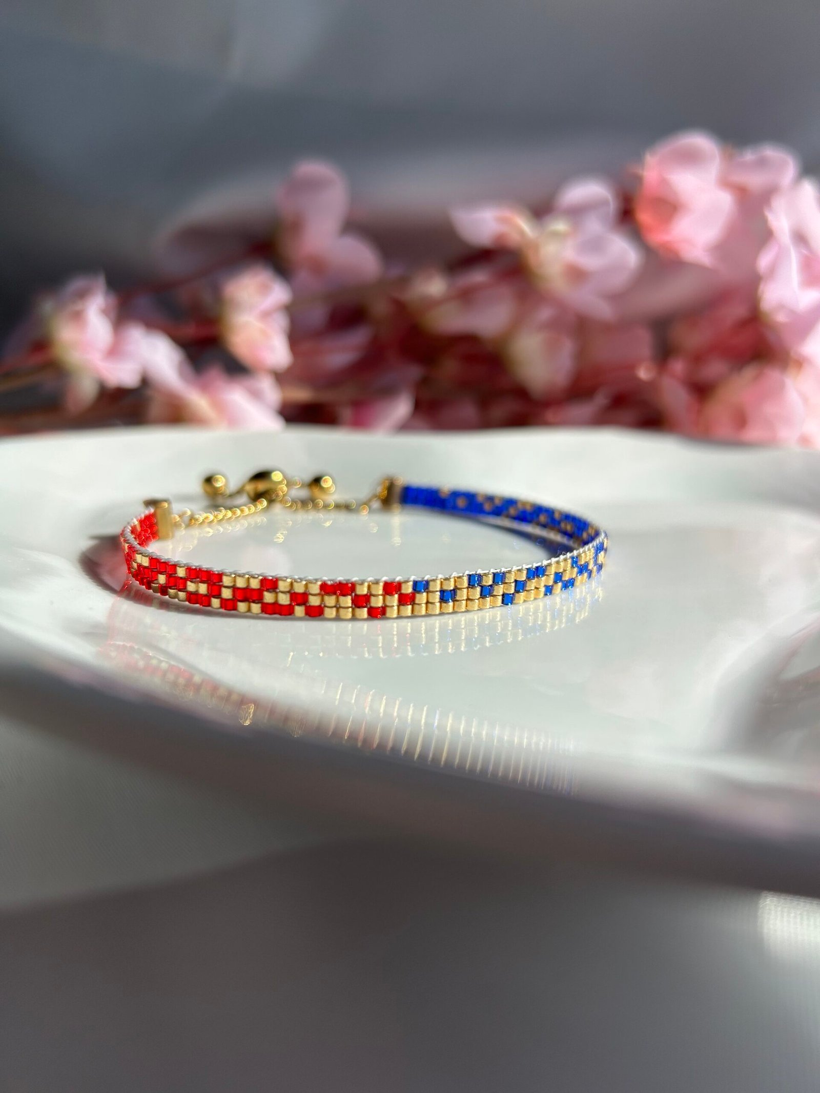 Tissé à la main en perles Miyuki bleu profond, or lumineux et rouge intense, il associe force, lumière et passion dans un équilibre harmonieux et affirmé.