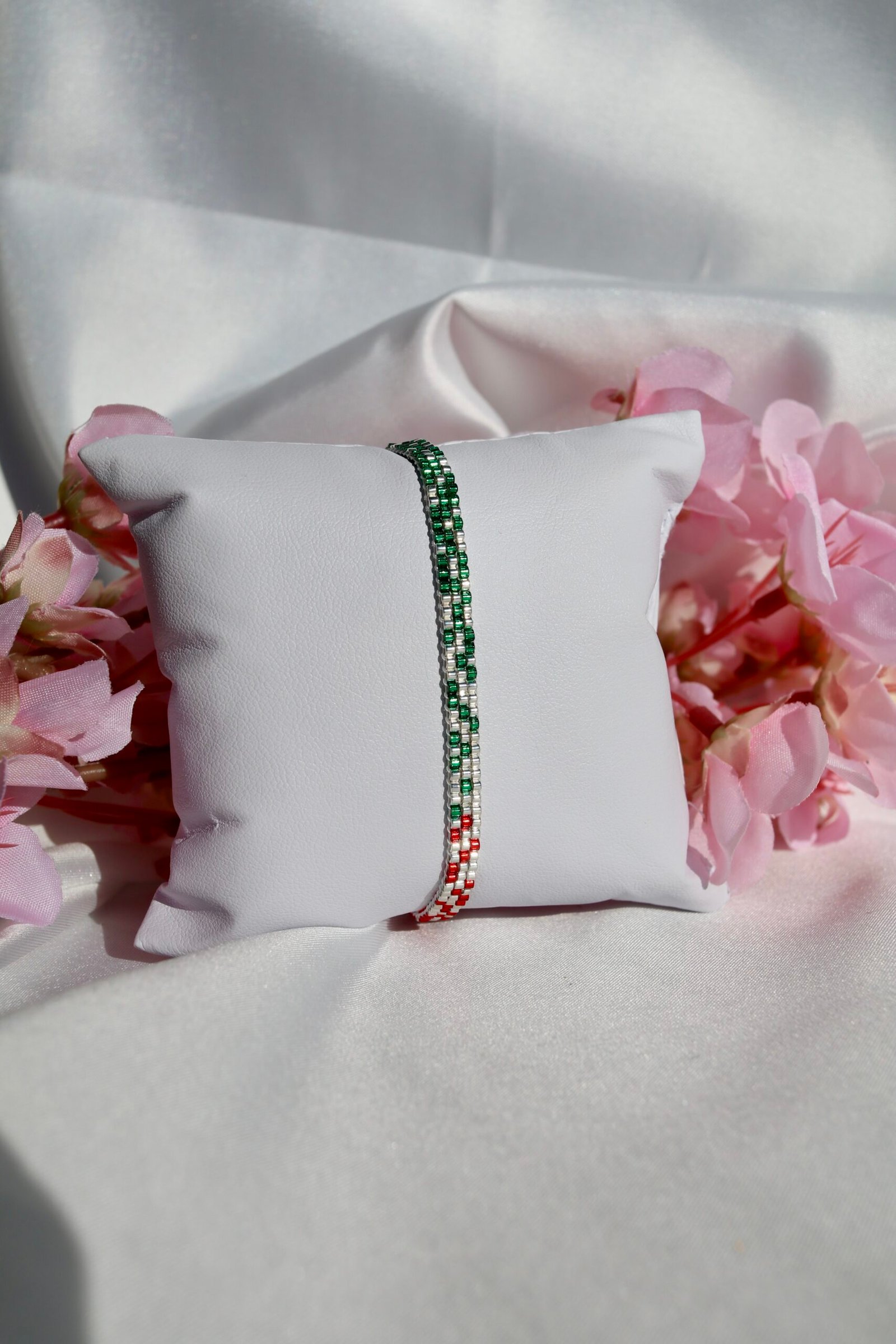 Tissé à la main en perles Miyuki vert intense, argent lumineux et rouge vibrant, il symbolise l’équilibre entre croissance, clarté et passion. Une harmonie de couleurs forte et naturelle, à la fois vivante et élégante.